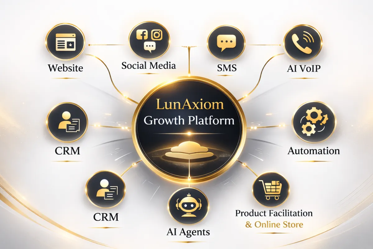 LunAxiom connects your website, messaging channels, social media, CRM, and automation workflows into one unified business system.